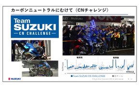 カーボンニュートラルに向けては、鈴鹿8時間耐久ロードレースに「チームスズキCNチャレンジ」として参戦。100%サステナブル燃料を使用し、タイヤ、オイル、カウル、ブレーキをはじめとした部品にはサステナブルな材料を用いたマシンで、トラブルに見舞われながらも総合33位で完走した。