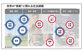 加藤氏はさらに「次世代のモビリティ社会における課題に対するスズキの技術戦略」として、高齢化が進んだことに起因する免許返納による移動制限や、公共交通の地域格差、労働人口の減少による物流や工場内運送など現場での人手不足の深刻化、新興国での交通渋滞や事故の増加など、自動車メーカーだからこそ解決しなければならない問題として、「クルマの本質価値の極大化」を技術戦略として追加したことを紹介。