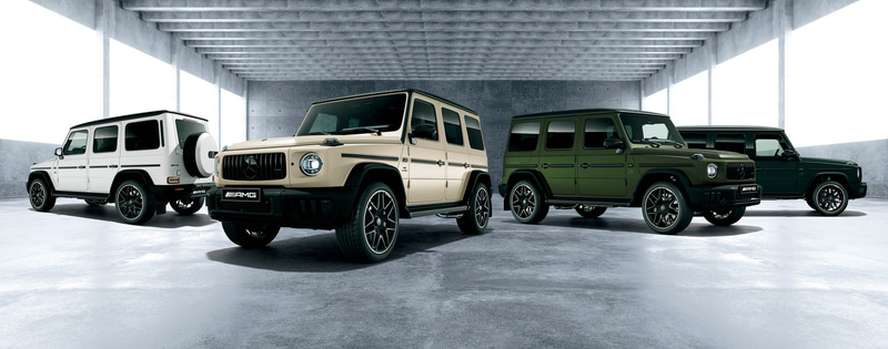 ボディカラーのほかにも、Gクラス初採用となる「AMG専用ブラックエグゾーストシステム」やブラックパーツが追加となる「AMGエクステリアナイトパッケージII」といった限定装備や、通常モデルでは有償オプションの「AMGナイトパッケージ」など、エクスクルーシブなアイテムを多数採用。これにより、ルーフやバッヂ、サイドオーナメント、フロント・リアのメルセデススター、バンパー・ホイールアーチ、ランニングボード、ブレーキ・キャリパーといった多くのパーツがブラックとなり、力強いブラックアクセントが限定車ならではの存在感を発揮している。また、ホイールもブラックの「22インチAMGホイール<鍛造>」を採用することで、引き締まった印象を与えている。