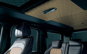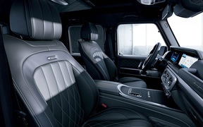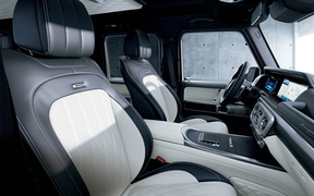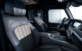 インテリアにもエクステリア同様にブラックアクセントが施されているほか、限定装備として「MANUFAKTURオープンポアブラックアッシュウッドインテリアトリム」や、Gクラスとしては日本初採用となる「MANUFAKTURフルレザーパッケージ」に加え、通常モデルでは有償オプションの「MANUFAKTURプログラム・プラス」「MANUFAKTURインテリアプラスパッケージ」を採用し、特別感を高めている。