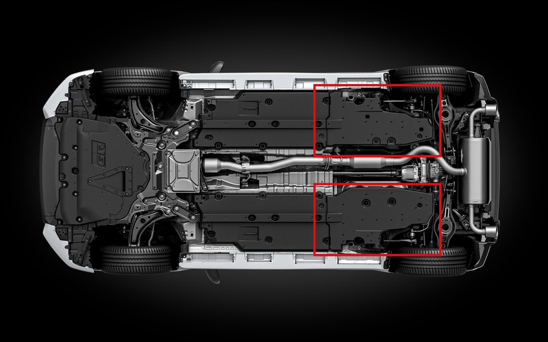 「燃料タンクアンダーカバー」はスーパー耐久シリーズ参戦車両の安全燃料タンクの下部をフラット形状にするアイデアを採用。ボディ下部の空気の流れを最適化し、空力性能を高める。