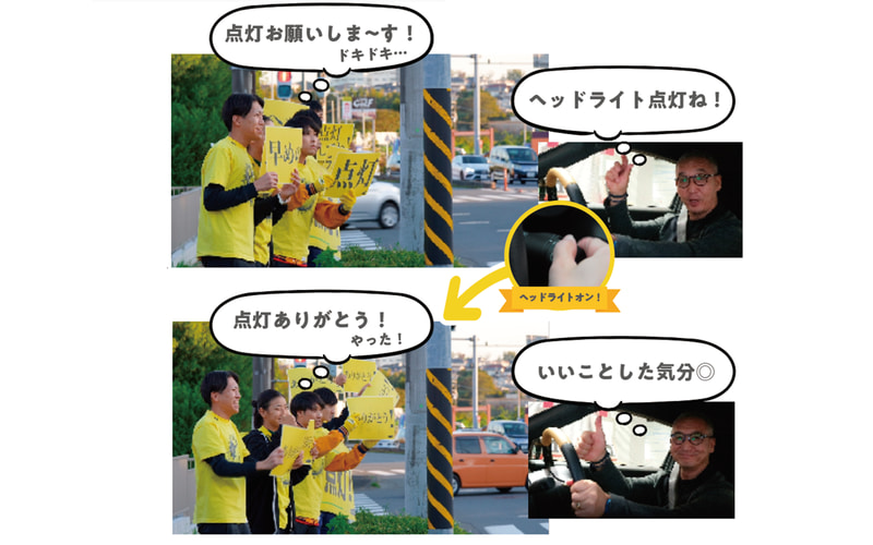 そのなかでも、2023年から行なっている「点灯ありがとう活動」は、交通ルールを遵守しながら、日の入り45分前を目安に、歩道から信号で停止しているクルマのドライバーに対して黄色いパネルを掲げて早めのヘッドライト点灯を呼びかけるもの。パネルアクションを実施すると同時に、ヘッドライトを点灯してくれたドライバーに「ありがとう」を伝えることで、お互いに気持ちのやりとりが交わされ“ほっこり”した気持ちになるとしている。