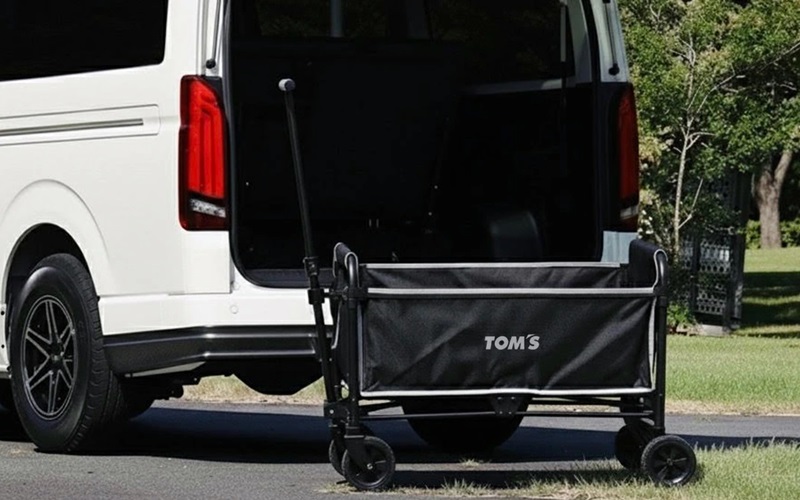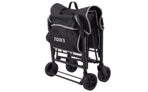 ハンドルはT字形を採用し、重たい荷物を載せた際にT字形のため2人でカートが引きやすく、縮めればコンパクトに収納が可能。さらに、座れる仕様となっており、いつでもどこでも休憩できるのがポイント。「TOM'S」のロゴおよびカーボン調生地のパイピングか所には、反射性素材を使用しているため、暗い場所でも視認性がよく、安全性も高めている。