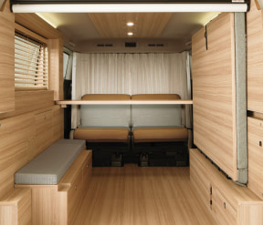 インテリアでは従来より後席と車中泊用ベッドの表皮に採用していた、ヘリンボーン生地を使用したMYROOMフロントシートカバーを新規設定。フロントシートにこのカバーを装着することで、車内全体に統一感が生まれた。