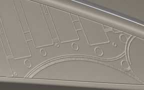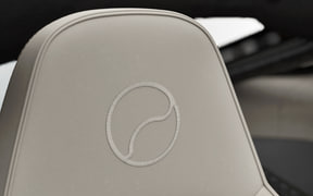 インテリアもMTCとのつながりをさらに深め、ヘッドレストにはインフォテイメントボタンにも使用されているMTCロゴを、助手席側ダッシュボードのフェイシアプレートにはMTCの側面シルエットを、ドア内張のフェイシアプレートには、MTCの設計図面から俯瞰図の一部を切り取ってデザイン化したものなど、建物デザインから抽出した造形が随所に配されている。