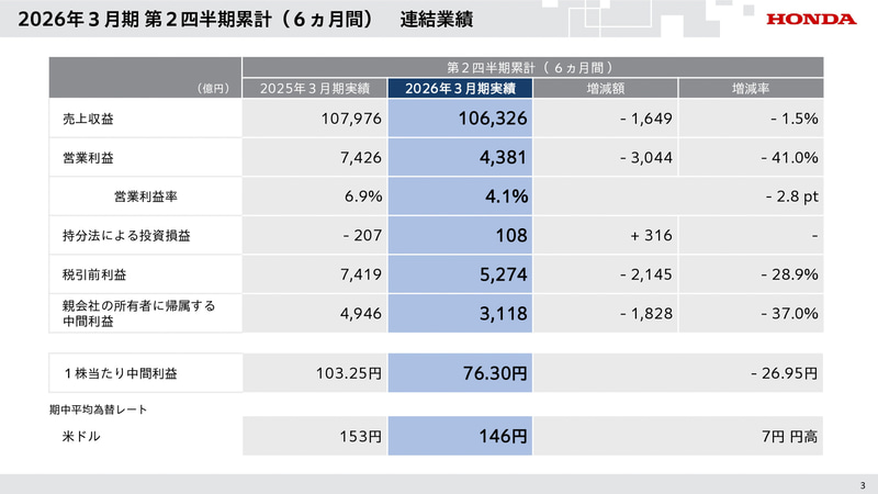 本田技研工業は11月7日、2026年3月期第2四半期決算説明会を開催。2026年3月期第2四半期累計(2025年4月〜9月)の連結業績は、売上収益10兆6326億円(前年同期比1.5%減)、営業利益4381億円(前年同期比41.0%減)、税引前利益5274億円(前年同期比28.9%減)、親会社の所有者に帰属する中間利益は3118億円で、営業利益率は4.1%となった。