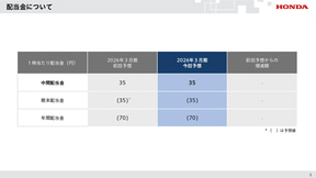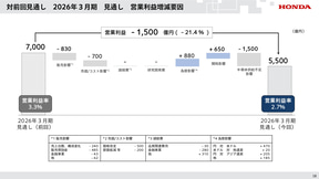一方、2026年3月期の連結業績見通しは、営業利益5500億円、当期利益3000億円とした。円安による増益を見込むものの、四輪の販売台数減少に加え、半導体供給不足の影響について現時点で見込まれる生産台数の減少を反映し、前回見通しが修正された。