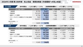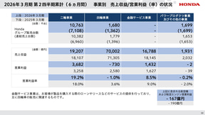 2026年3月期第2四半期の実績で、事業別の営業利益では、二輪事業で3682億円、四輪事業で730億円の赤字、金融サービス事業で1432億円、パワープロダクツ事業およびその他の事業で2億円の赤字となった。