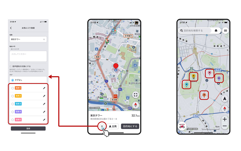 お気に入りの景観スポットや飲食店、買い物スポットなどを5種類のタグに分けて、利用者の好みのタイトルと色で表示できる「タグ分け機能」が追加。地図上に表示されるタグアイコンから簡単にルートを探索できる。また、お気に入り地点も100件まで登録可能となった(従来は50件)。