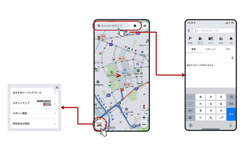 また、目的地などを検索する「検索バー」と、スポットマップの表示やおすすめツーリングコースの設定などを行なう「MOTTO GOボタン」を地図画面に追加し、操作性を向上させている。