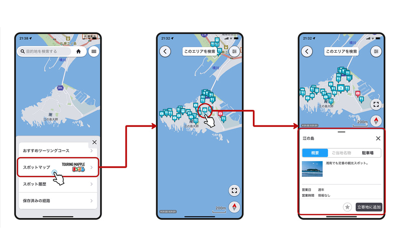 今回のアップデートでは、ツーリングを計画する際に観光スポットなどの情報を地図上で確認できる「スポットマップ機能」と、お気に入り地点にタグを付けて色分けできる「タグ分け機能」が新たに追加された。