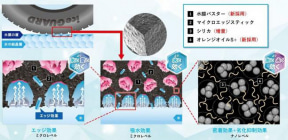 コンパウンドには新開発の「冬ピタ吸水ゴム」を採用。基盤となる素材が一新され、従来よりも小型で多層構造とした天然由来素材「水膜バスター」を高密度に配合して、氷上でタイヤが滑る原因となる水膜の吸水力を向上。氷上での「接触の密度(氷とゴムの接触点)」を従来品のコンパウンドから63%増加させて氷上性能を飛躍的に高めている。また、シリカの増量と新素材である「オレンジオイルS+」を配合したことで、低温時でも優れたドライ&ウェットグリップを発揮するとともに、約4年後まで氷上摩擦力の低下を抑制する。