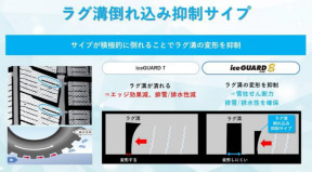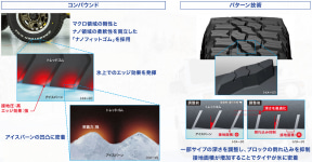 新開発されたトレッドパターンでは、新技術の「L字タンクサイプ」によって氷上で接地面のブロックに水が侵入することを抑制し、ブロックの表面に微細な溝を施す「アクアドレイン加工」でタイヤ装着の初期から優れた氷上性能を実現。また、ブロックの先端部分に突起を設けた「L字ブロック」がブロック周りに水が回りこまないよう抑制して接地性を高めている。