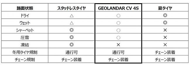 これら新開発のコンパウンドとパターン設計を与えたことで、ドライ性能を確保しつつ高いウェット性能と雪上性能を実現。急な降雪にも対応可能なであると示す「M+S(マッド&スノー)」規格に加え、国際基準で定められたシビアスノータイヤ条件に適合した証である「スノーフレークマーク」を全サイズで獲得して、冬用タイヤ規制、チェーン規制時でも走行可能なタイヤとなっている。