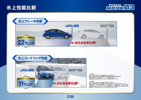 これらの技術により、従来品のブリザック VRX3と比較して氷上でのブレーキ制動距離が11%短縮。氷上旋回時のラップタイムは4%短縮し、さらに氷上での車両挙動の安定性も向上している。