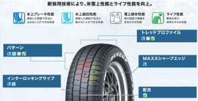 スタッドレスタイヤとしての性能では、タイヤの回転方向に刻まれた長い溝(サイプ)が旋回時のひっかき効果を高め、横滑りを抑制する「インターロッキングサイプ」、タイヤ表面にあるブロックの倒れ込みを防ぎ、氷上ブレーキ性能と雪上操縦安定性を向上させる「MAXXシャープエッジ」といったダンロップ独自の技術が与えられている。