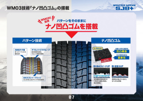 ウィンターマックス SJ8+は、乗用車向けスタッドレスタイヤであるウインターマックス 03で採用して「ダンロップ史上最高の氷上性能」の実現に大きく寄与している「ナノ凹凸ゴム」の技術を、SUV用スタッドレス「ウィンターマックス SJ8」のトレッドパターンと組み合わせることによって氷上性能を大幅に進化させた製品。