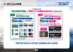 また、多方向にラグ溝やスロットを配置することで氷上ブレーキ時のひっかき効果を発揮させるとともに、ピッチ数を従来の56から68へと21%アップさせ、前後のトータルエッジ成分を従来品比で7%高め、氷上ブレーキ性能も8%向上させた。