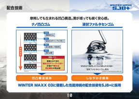 ナノ凹凸ゴムは、ゴム内に含まれる「MAXXグリップトリガー」により摩耗しても凹凸構造を維持し続けるとともに、素材メーカーのクラレがウインターマックス向けに開発した素材「液状ファルネセンゴム」の採用により、ゴムのしなやかさが長期にわたって保たれ、その高い氷上性能を長期間維持。「ナノ凹凸ゴム」と「液状ファルネセンゴム」を組み合わせることで、ウインターマックス 03では、従来品以上の効き持ちを実現した。新品時の氷上ブレーキ性能では従来品比で22%向上し、氷上コーナリング性能も同11%向上させている。