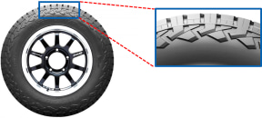 また、センターにある特別な「3Dブロック」の形状で偏摩耗を抑制し、ショルダー部分にあるブロックではサイプの入れ方を工夫することでブロック剛性を高め、耐久性を向上させている。