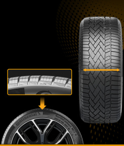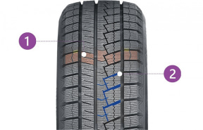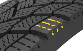 内側のショルダーはサイプ密度を高め、多方向の溝によって雪上でのトラクションとブレーキングのパフォーマンスを向上。剛性の高い2つの中央ブロックは高いステアリングレスポンスを実現するために設計され、3本の縦溝は排水を促進させる。また、外側のショルダーはサイプ密度は低くして、剛性の高い一連のブロックとして構成。コーナーリング時に横方向の力を制御する。