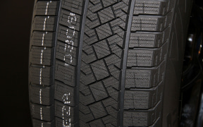 さらに「ダブル・サイドトゥサイド・グルーブ」と呼ばれるジグザグのグルーブを2本レイアウトすることで、トレッド面の接地圧を均等化してスノー&ウェット性能を向上。また、スクエア形状のブロックをレイアウトし、ショルダー部の最適化との相乗効果による効果的な接地面の実現で氷上性能を高めている。