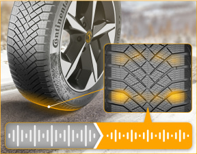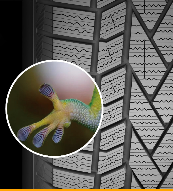 トレッドパターンでは左右非対称を基調とした「ゲッコー・グラブ・パターン 2.0」により、雪や氷上でのグリップ力を高め、優れたブレーキングと十分なトラクションを実現する。また、千鳥状のパターンとサイプの設計で幾何学的な角度を最適化した「サイレント・トレッドパターン」を採用。トレッドブロックが路面に接地するタイミングを分散させて気柱共鳴音の伝達を抑制し、車内に伝わる騒音レベルを低減して快適性の高いドライブ体験を提供する。