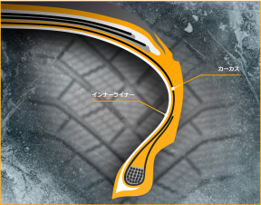 カーカス・プロファイルも幅広の特別設計である「ワイド・カーカス・プロファイル」を採用。タイヤと路面の接触面積を増加させ、ドライ、スノー、アイスといったさまざまな路面におけるグリップ力が向上しており、とくに凍結路面では接地面効果によって氷上性能を向上させている。