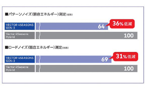 さらにセンターに向かって狭くなっていく溝とパターンを最適化した「新Vシェイプドトレッド」がノイズを低減して、従来品との比較でパターンノイズを36%、ロードノイズを31%低減することに成功。アンダートレッドははより強い構造が与えられ、負荷の大きいショルダーブロックも強固にしてステアリング操作時のタイヤ変形を抑え、優れたドライハンドリング性能を実現する。
