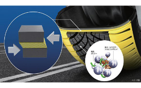 コンパウンドにはマイクロシリカを配合してドライ性能と操縦安定性を向上。新配合したポリマーの効果でドライ、ウェット、雪上などさまざまな路面におけるトラクション性能を高めた。