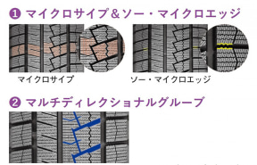 このほかトレッド面には、マイクロサイプによって水幕を破りつつ、ブロックに設定したのこぎり歯状のエッジで氷や雪を捉える「マイクロサイプ&ソー・マイクロエッジ」で氷雪路のトラクション性能を高め、多方向性の「マルチディレクショナルグルーブ」の採用で氷雪路における力強いグリップを発揮する。