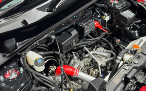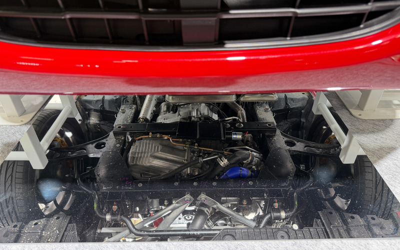 会場では車両の近くまで寄ることができ、エンジンの搭載方法が確認できる。車両下部には鏡も用意されていて、自社製品を流用しながらFR化されたパワートレーンの様子を確認することができる。