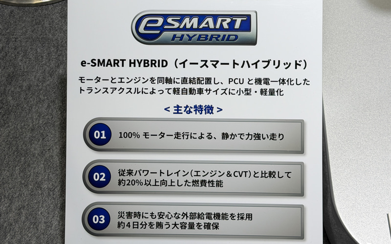 これは、ロッキーHEVの「e-SMART HYBRID」を軽量・小型化したハイブリッドシステムとなり、100%モーター駆動による静かで力強い走りを従来通りの使い方(充電不要)で実現するという。軽自動車にも本格的ハイブリッドシステムの登場を予感させる展示となっている。