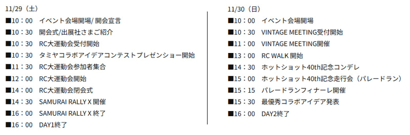 11月29日には、RCカーによるPK対決、RCカーをジャンプさせて的を狙うダーツ、RCカーと操縦者が一緒に走るリレーの3競技など、チーム戦で盛り上がる「RC大運動会」を実施。30日はRCカーを操縦しながら森の中を散歩する企画「RC WALK」と、1980年代発売のタミヤ製オフロードRCカーのみを使用したレース「TAMIYA VINTAGE MEETING」が行なわれる。また、スポーツキャスターでRCカーファンの荻原次晴氏も参加して、イベントを盛り上げる。
