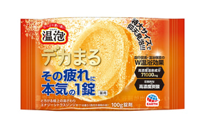 発泡入浴剤の温泡 デカまるは、「温泡こだわりゆず」と比較して約2.5倍となる医薬部外品最大量(医薬部外品承認基準最大)の特大サイズ(100g)の発泡錠剤が特徴。特大サイズが生み出す強力発泡で有効成分がお湯にすばやく広がり、高濃度炭酸・温泉成分(炭酸水素ナトリウム、炭酸ナトリウム、乾燥硫酸ナトリウム)の血行促進と高濃度イオンベールの温浴保護で、さら湯と比較して温浴効果をアップ。とろける極上の湯ざわりを感じられる製品となっている。
