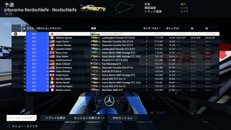 限られた時間ではあったが、走り込むことで予選タイムで6分59秒284を出すことができた。「ニュルブルクリンク北コース」はコースが狭くてなかなか車両を抜くチャンスが少ないので、対戦するライバル車両のAI難易度を30に低く設定して、なんとか出せたタイム。