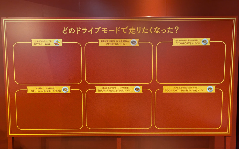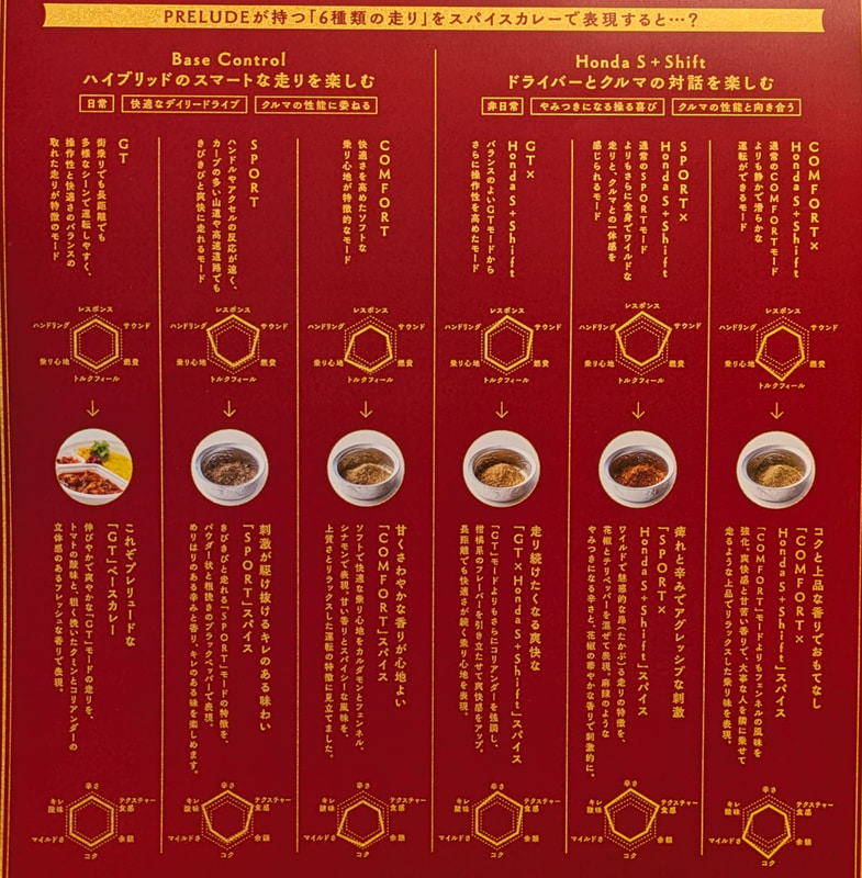 まずは、年間850食のカレーを食べ、渋谷でカレー教室も開いているスパイス料理研究家で“カレーの先生”こと一条もんこさんに、プレリュードに備わるドライブモード「GT」を基準(ベースのカレー)と位置づけ、「SPORT」「COMFORT」、さらにホンダ独自の「S+Shift」を掛け合わせた「GT×S+Shift」「SPORT×S+Shift」「COMFORT×S+Shift」の計5種類のモードをスパイスで再現しつつ、それをベースのカレーに加えることで乗り味の変化を表現してほしいと依頼。