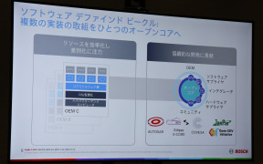 世界各国にある多くの自動車メーカーでアップデートなどのデータを作成するにあたり、データの基準となる標準仕様が必要だとの考えが自動車業界で課題になっていると語り、標準仕様がある一方、各自動車メーカーで開発する技術では会社ごとのDNAが埋め込まれたものが車両に搭載され、使用されるなかで70%は標準化されたソフトウェアになり、標準仕様をコミュニティで共有できるようにすればコストを削減し、品質の向上を果たすことにもつながるとボッシュでは考えており、共有可能な標準仕様の策定に積極的に取り組んでいると説明している。