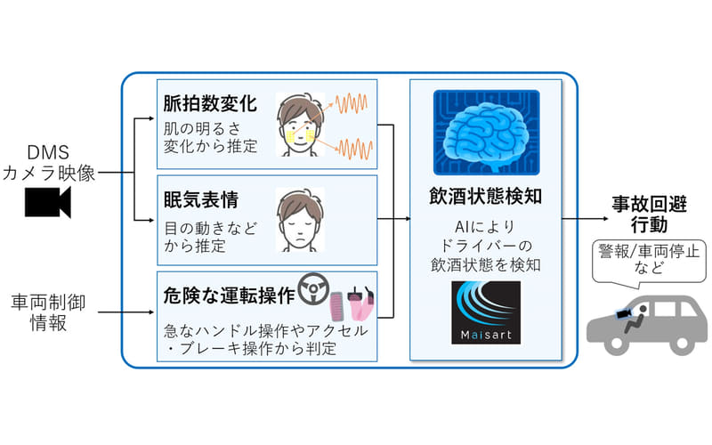 三菱電機は12月16日、運転中のドライバーのわき見や居眠りを検知する「ドライバーモニタリングシステム(DMS)」 の映像から非接触で取得した脈拍数や、車両制御情報などを組み合わせることで、運転中のドライバーの飲酒状態を推定する技術を発表した。