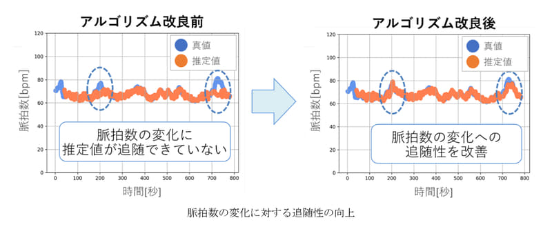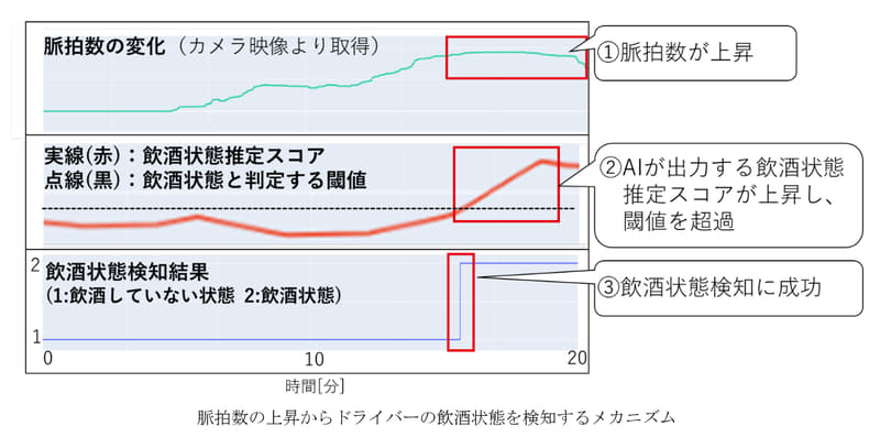 そこで三菱電機は、DMSの近赤外カメラを用いて取得したドライバーの顔映像から、脈動に伴う血液流量変化による皮膚反射の微小輝度変動を抽出することで、非接触で脈拍数を計測。アルゴリズムの改良により走行時の外乱を抑制し、脈拍数の変化への追随性を向上させることで、飲酒による交感神経活性化に起因する脈拍上昇を高精度に検出できるようにした。