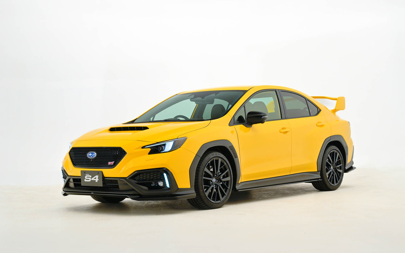WRX S4の「STI Sport R EX」グレードをベースに、ボディカラーに特別色のサンライズイエローを採用。エクステリアでは、18インチアルミホイール(マットブラック塗装)や、ヘッドライト、ドアミラー、ルーフアンテナなどをブラック仕立てとして、スポーティさを強調した。