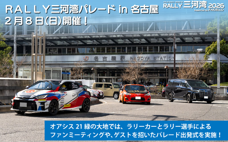 愛知県は、名古屋市内で2月27日~3月1日に開催される「RALLY三河湾2026」を盛り上げるイベントとして、「RALLY三河湾パレード in 名古屋」を2月8日10時~12時30分に「オアシス21 緑の大地(名古屋市東区東桜1-11-1)」にて開催する。