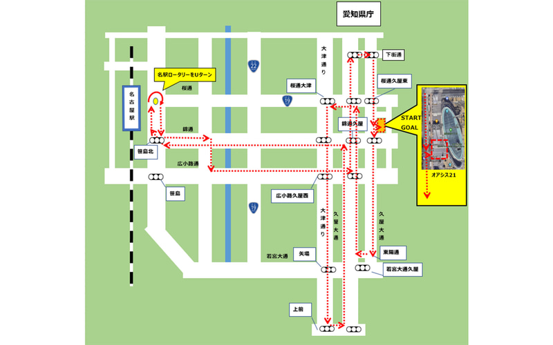 名古屋市内中心部でラリーカーによるパレードを実施。ルートはオアシス21緑の大地をスタートし、栄、名古屋駅周辺を通り、再びオアシス21緑の大地に戻る約10kmのコース。