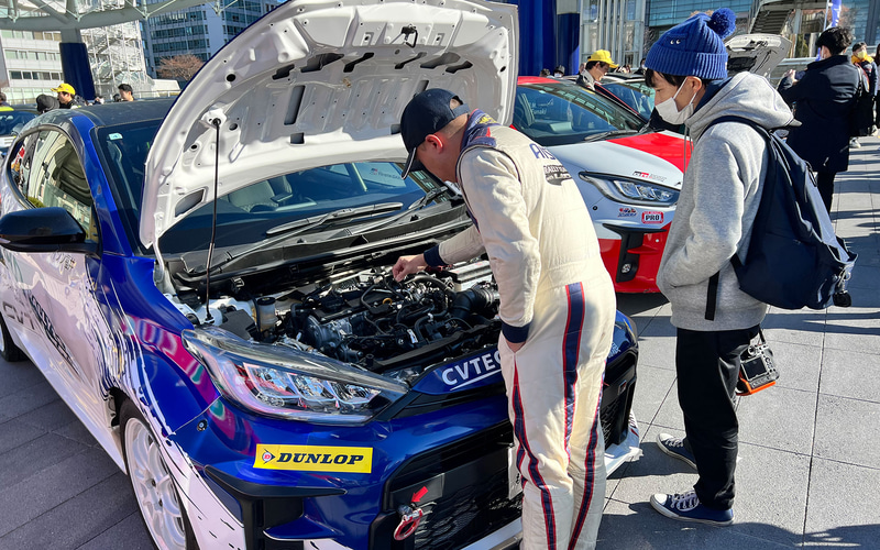 オアシス21緑の大地内にラリーカーを展示するほか、ドライバー、助手席でドライバーをナビゲートするコ・ドライバーによるラリーカーの説明を実施。また、写真撮影は、一部車両は車内に乗車しての撮影も可能。