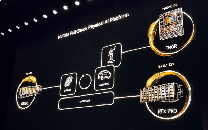 NVIDIAはこのアルパマヨを核としてフルスタックのAV(Autonomous Vehicle、自動運転車)向けフィジカルAIプラットフォームを提供。生成AIを使用したNVIDIA COSMOSによるトレーニング、デジタルツインであるNVIDIA OMNIVERSEによるシミュレーション、そしてNVIDIA Thorによるインファレンスを用意している。