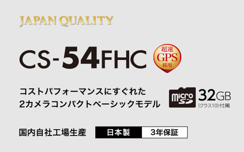 CS-53FHCは、本体に前方録画カメラを搭載した前方録画メインのシンプルでコンパクトなモデル。フレームレートの変更で長時間の撮影も可能としたほか、必要に応じてオプションの別体リアカメラを追加することで後方録画にも対応できる。また、ソニー製STARVIS IMX307を内蔵した「ナイトクリアVer.2」も搭載し、夜間やトンネルなど少ない光量でも綺麗な映像を記録できる。