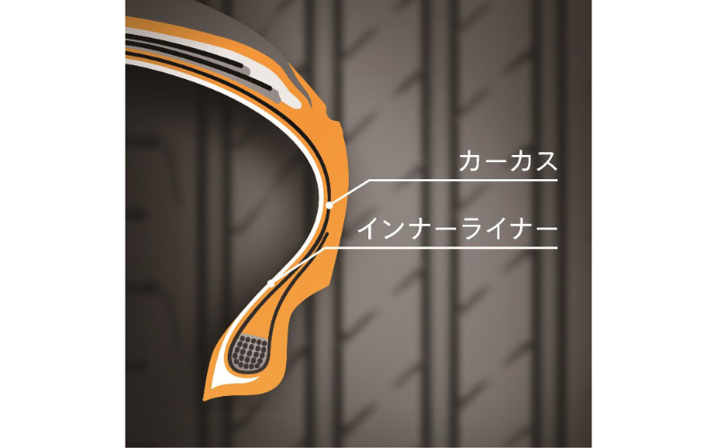 また、タイヤは走行中に路面との接地により常に変形を繰り返すが、このとき内部で発生するヒステリシス摩擦(エネルギー損失)が転がり抵抗を増加させている。そのため低ヒステリシス素材をカーカスおよびインナーライナーに採用することでエネルギー損失を抑制し、転がり抵抗を低減。その結果、燃費向上やEVの航続距離延長を実現しながら、耐久性や剛性を損なうことなく高い走行性能を実現したという。