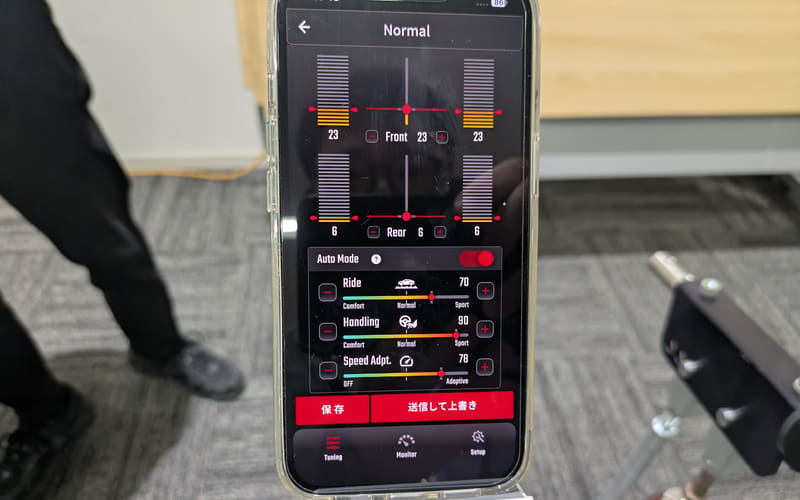 なお、車室内にコントローラーユニットを設置して、ボタンやダイヤルで減衰力調整を行なえる商品も他メーカーから出ているが、カヤバのアクトライドはスマホを使用するため、新たにコントローラーを製造する必要もないし、在庫を抱えることもないので、カヤバとしてもユーザーとしてもコスト面でメリットが高い。さらにソフトウェアは後からアップデートできるので、末永く利用できるのも大きなポイントという。