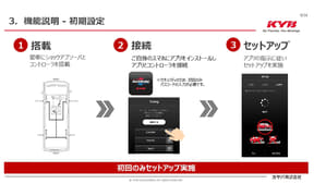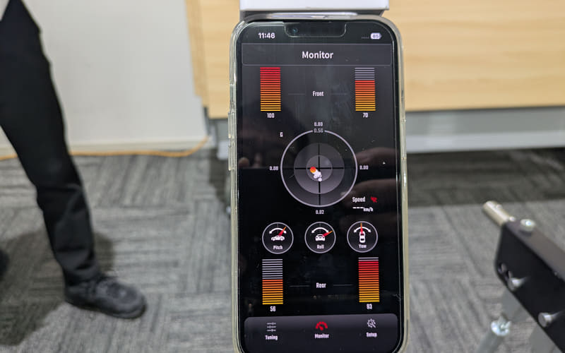 コントローラーとショックアブソーバーを装着したら、アプリから初期設定を行なう必要がある。装着車種や駆動方式、コントローラーを車両のどのあたりに設置したか? またコントローラーの向きの設定。最後に水平な状態かの確認を行なう。とにかくコントローラーが車両の挙動を把握して信号を出すため、初期設定がとても重要になる。