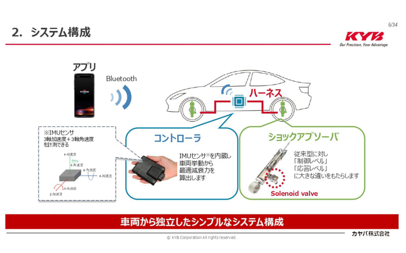 アクトライドの基本構成は、「アクトライドアプリ」「コントローラー」「ショックアブソーバー」の3つで、アプリをインストールしたスマホとコントローラーはBluetoothで接続。コントローラーは3軸加速度と3軸角速度をワンチップで計測できる小さな「IMU(Inertial Measurement Unit:慣性計測ユニット)センサー」を内蔵し、コントローラーと4本のショックアブソーバーは配線で接続する。